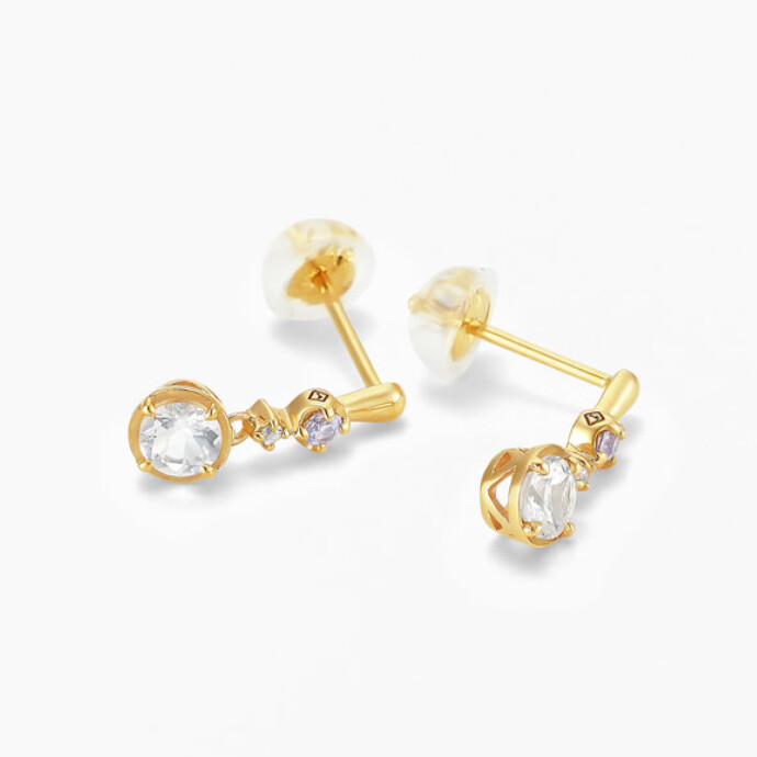 ホワイトトパーズとタンザナイトが耳元で軽やかに揺れ、光を集めてきらめくスイングピアス。