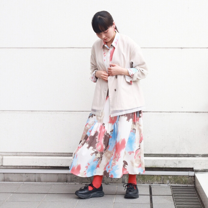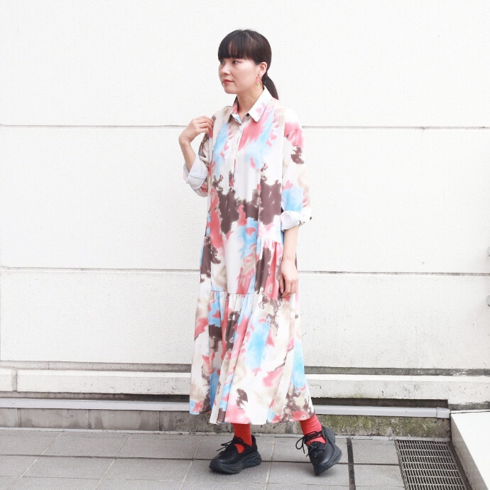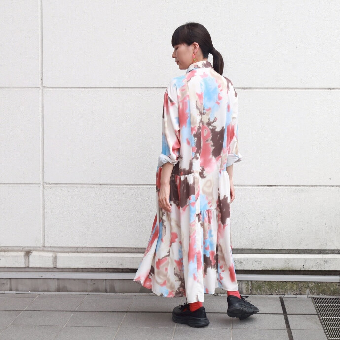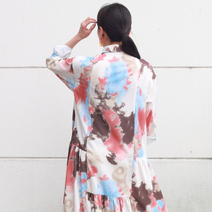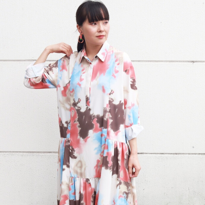 プリント切替ギャザーシャツワンピース