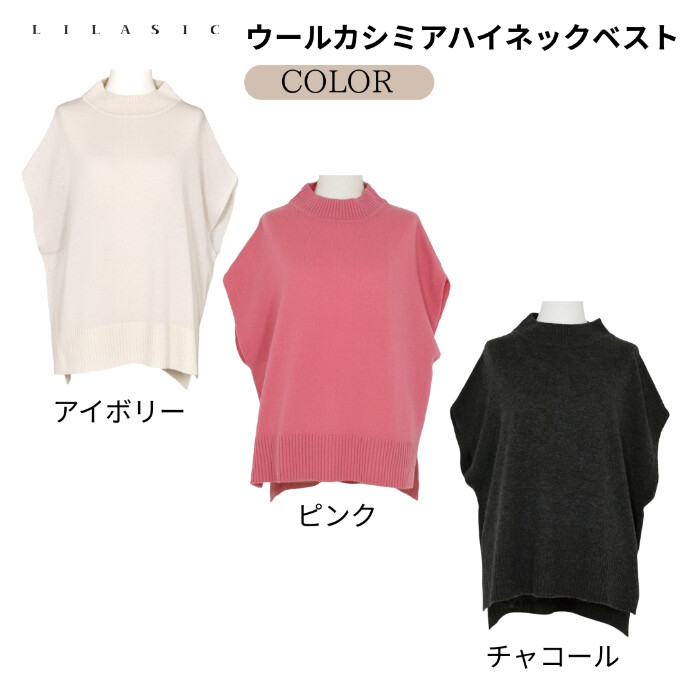 低めのハイネックと前後差のある着丈、スリット入りのデザインがポイントです。