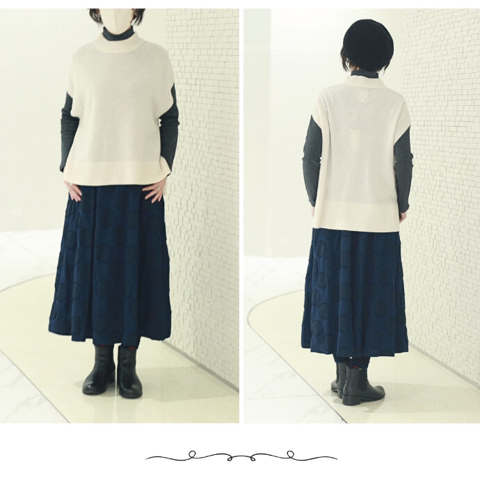チュニック丈のシャツや接結素材とのレイヤードスタイルにおすすめの一枚です。