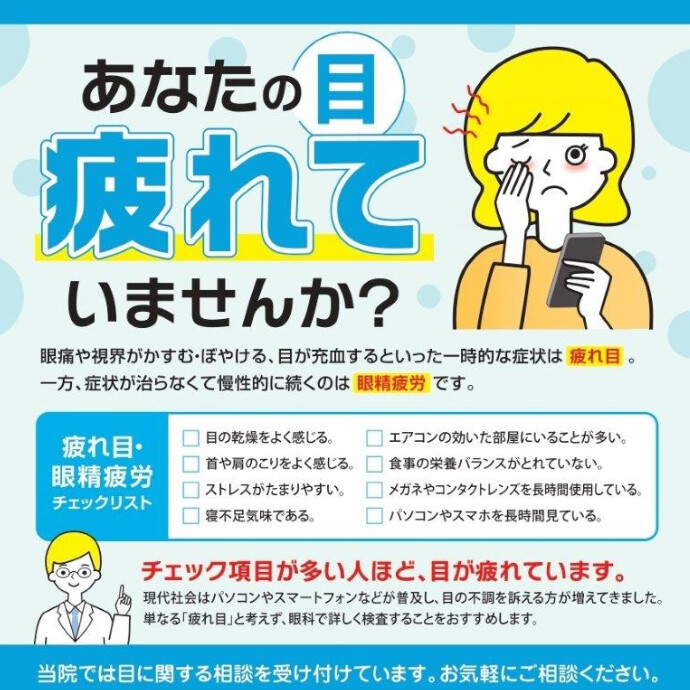 眼に不快感、気になる症状はございませんか? 土日祝日も診察してます。 お気軽にご相談ください。